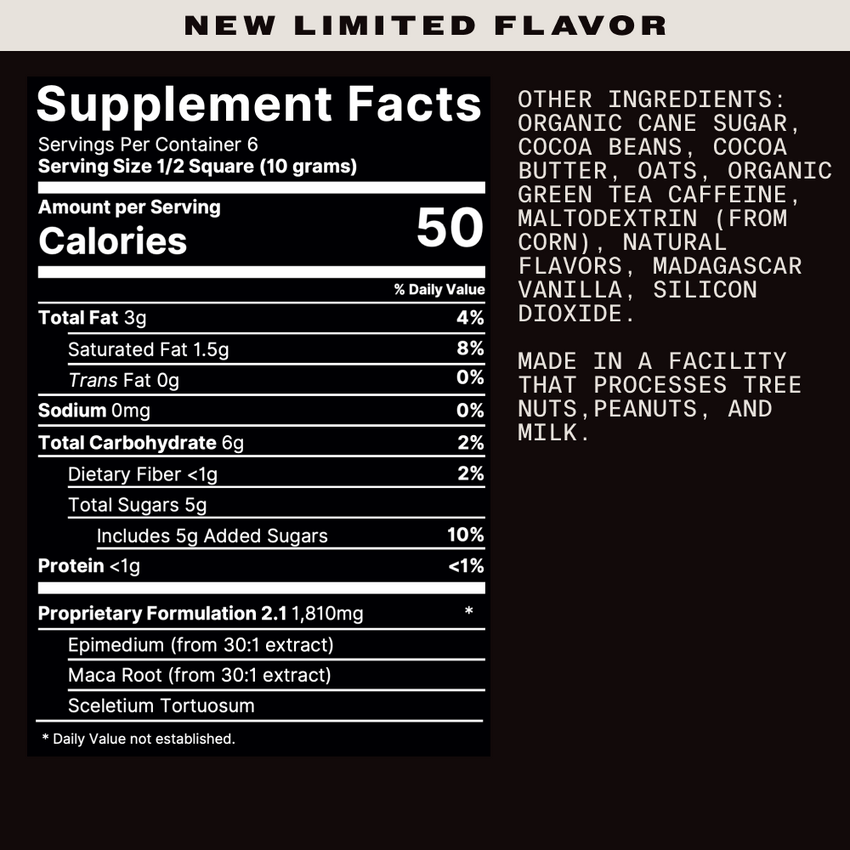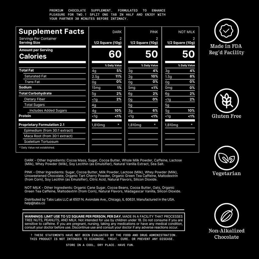 Tabs are proudly manufactured in the USA and composed of the finest USA sourced chocolate and dietary supplements. Learn more here.