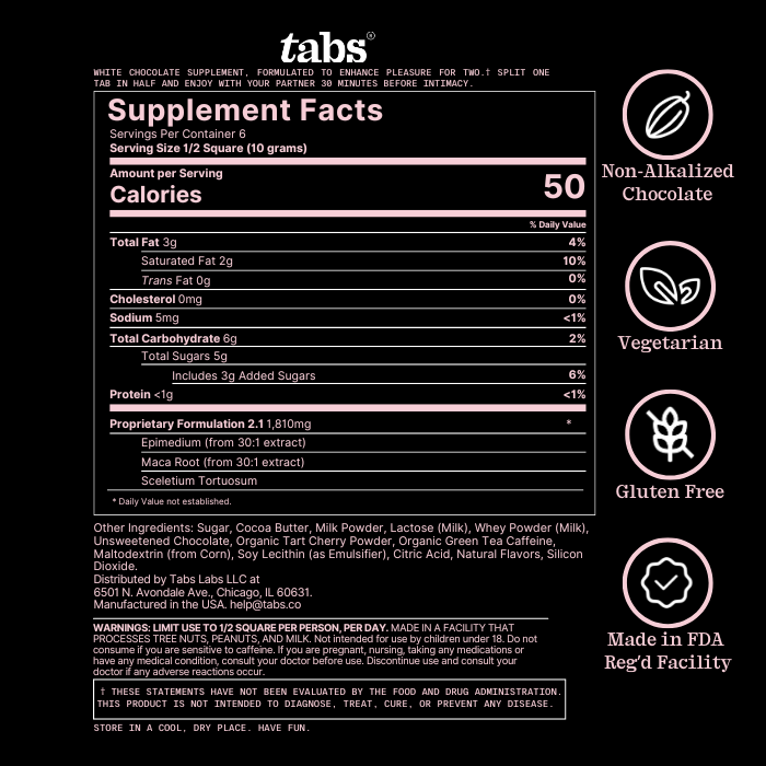 Tabs are proudly manufactured in the USA and composed of the finest USA sourced chocolate and dietary supplements. Learn more here.